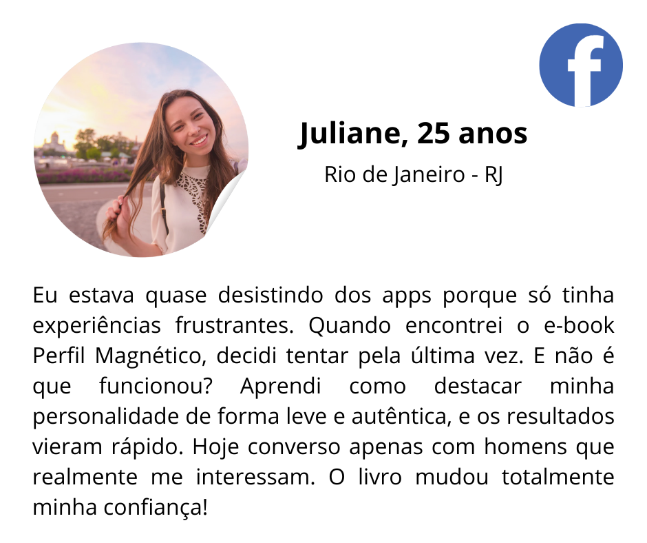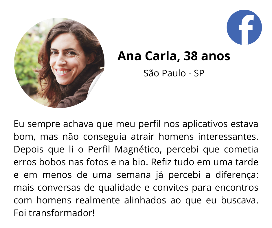 Minha paixão sempre foi entender os casais e como e o que funciona para atrair um homem certo, e o que as mulheres devem fazer para isso acontecer. Por isso, estudei a fundo os segredos por trás da confiança, carisma e magnetismo que elas transmitiam. E com essas descobertas, desenvolvi o Perfil Magnético, combinando ciência moderna e psicologia de casal para transformar você na sua melhor versão.